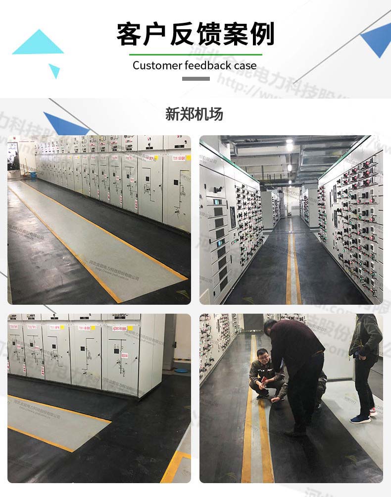 配電室電壓10KV,選8mm厚,工頻耐壓實驗10000V,1分鐘不擊穿,在工頻耐壓實驗18000V,20秒擊穿;配電室電壓 35KV,10-12mm厚,工頻耐壓實驗15000V,1分鐘不擊穿,在工頻耐壓實驗26000V,20秒擊穿;配電室低壓500V以下,選5mm厚,工頻耐壓實驗3500V,1分鐘不擊穿,在工頻耐壓實驗10000V,20秒擊穿。